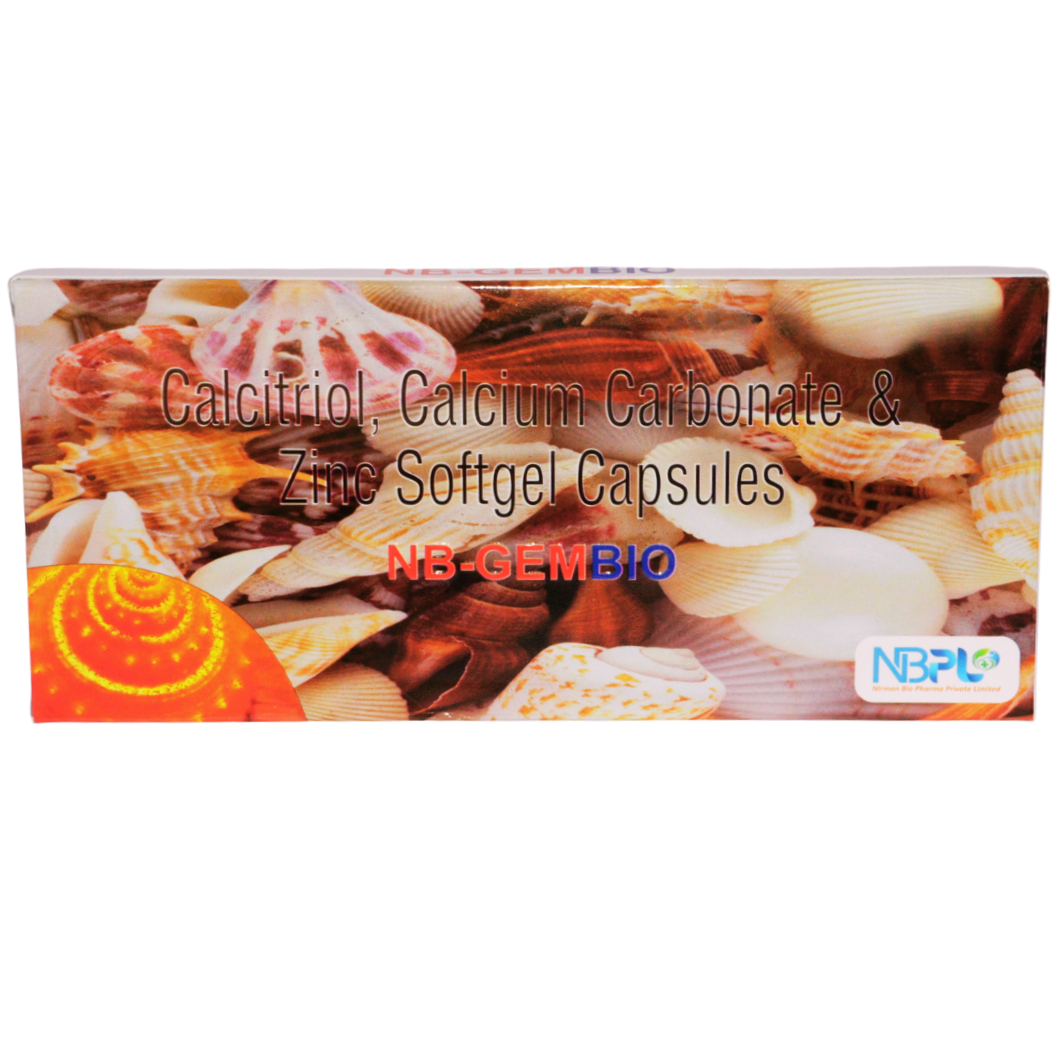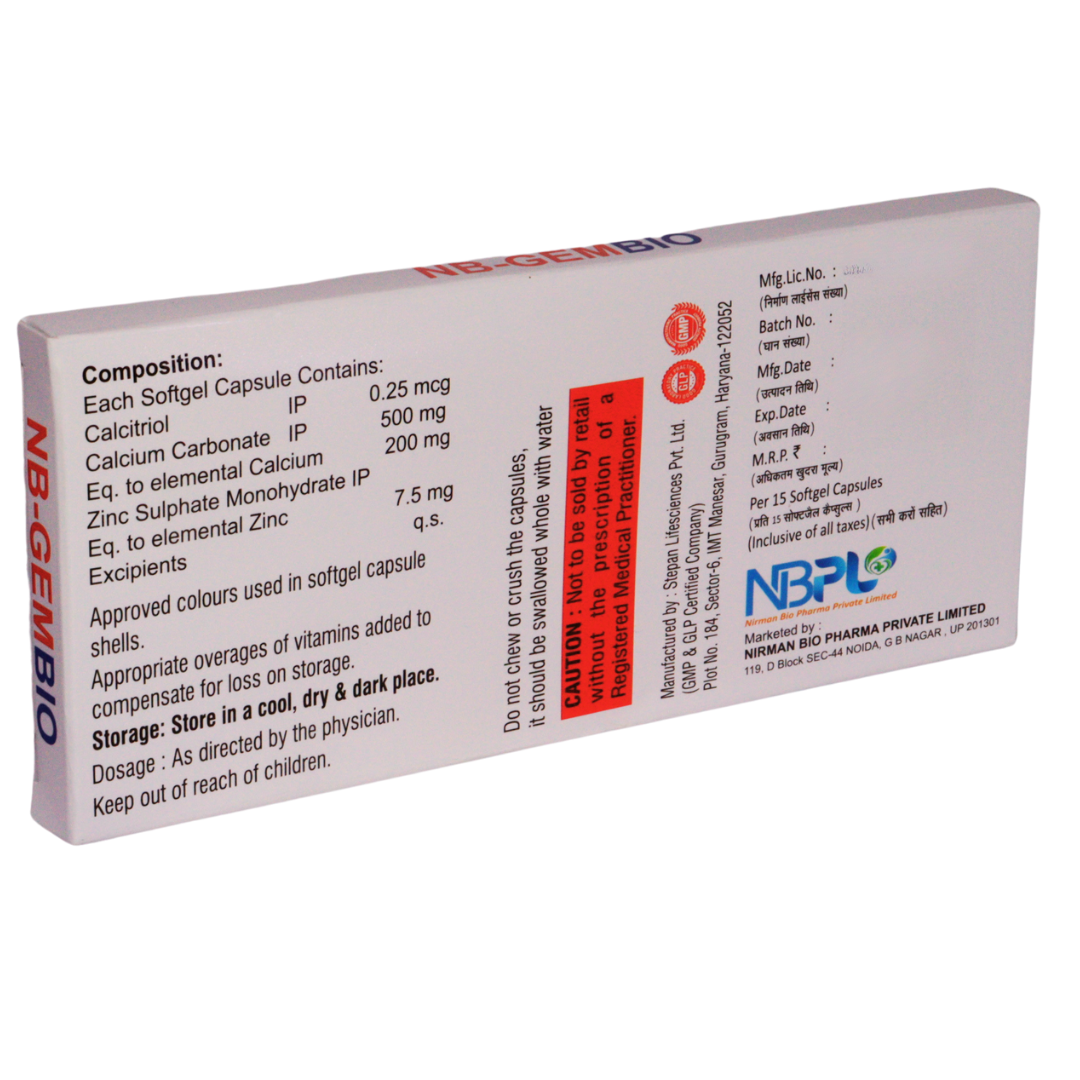 NB-Gembio Softgel is a dietary supplement formulated to support bone health and overall vitality. Each softgel contains: Calcitriol: A form of vitamin D that enhances calcium absorption for stronger bones. Calcium Carbonate: Provides a vital source of calcium necessary for maintaining bone density. Zinc: Supports immune function, cell growth, and overall health. This supplement is designed for daily use to help maintain healthy bones and support general well-being. Follow your healthcare provider’s dosage instructions for best results. NB-Gembio is available in softgel form at pharmacies and online.